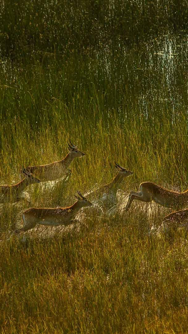 With their elegant leaps and graceful movements, lechwe are the epitome of agility and poise on the African savanna. These antelopes, known for their distinctive reddish-brown coats and lyre-shaped horns, are native to the wetlands and floodplains of south-central Africa, including the Okavango Delta in Botswana, which is a UNESCO World Heritage Site. Lechwe are social animals, often found in herds of thousands. In the heart of the delta, they are an integral part of the region"s rich biodiversity, coexisting with other species like elephants, lions, rhinos and hippos, wading through the water. Their presence adds to the delta"s natural allure, which draws in thousands of safari enthusiasts, and is proof of wildlife"s resilience in the face of environmental challenges.