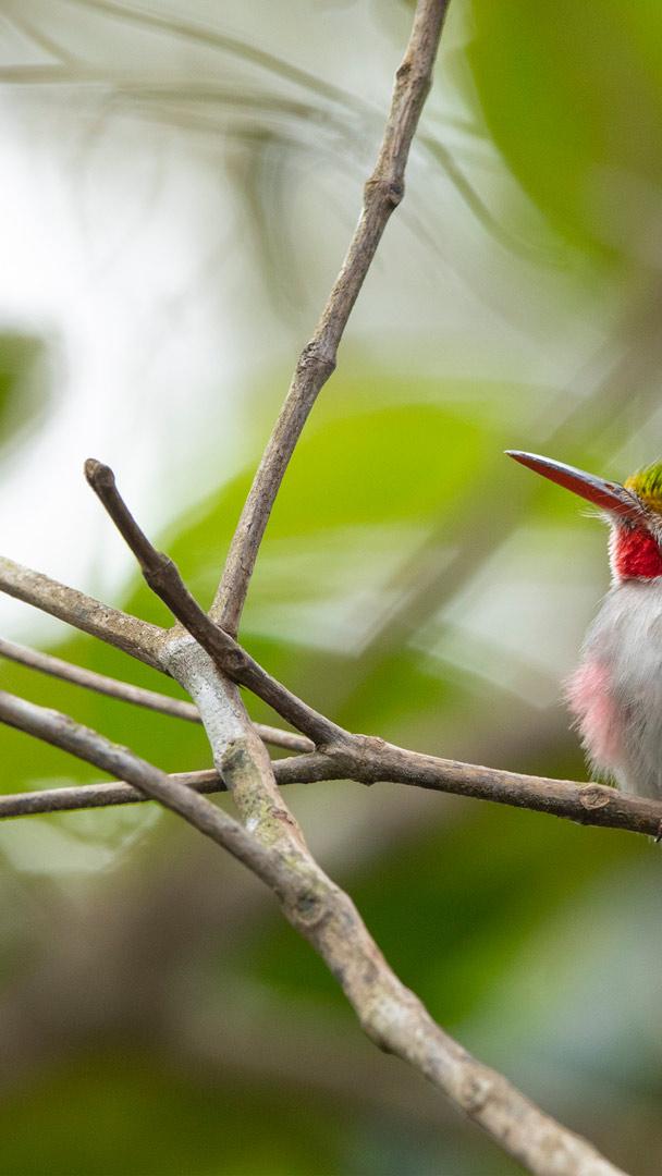 The tiny, colourful Cuban tody can only be found on Cuba and its neighbouring islands. Its vibrant outfit gives it a unique look: sparkling green back, pale grey underparts, red throat, pink flanks, blue ear patches and a black and red beak. Despite their colourful plumage, their size makes them hard to see; however, they are easy to hear. The soft sound of "pprreeee-pprreeee" or a short "tot-tot-tot-tot" will tell you there"s a tody somewhere nearby.