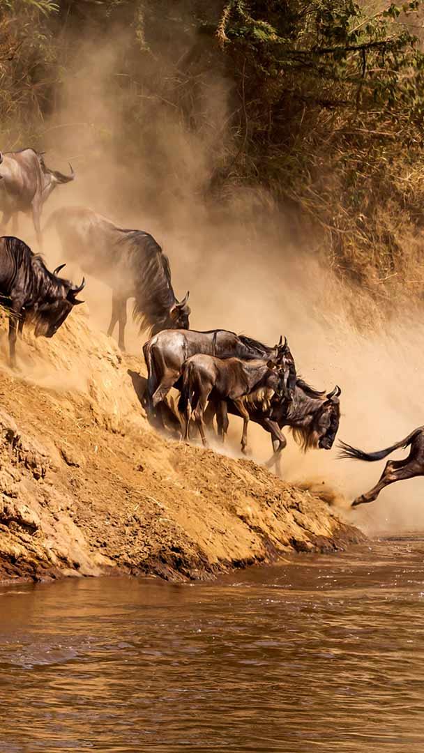 They say the grass is always greener on the other side, and no one takes that more literally than the wildebeests of the Serengeti in Tanzania. Every July, roughly 2 million of these determined grazers, along with zebras and other herbivores, set off on a journey to the Masai Mara in Kenya in search of lush pastures and fresh water. The great migration, considered one of the seven wonders of the natural world, is a safari spectacle where survival is the prize. One of the most dramatic moments of the migration is the crossing of the Mara River. Thousands of wildebeests gather at the riverbank, aware that danger lurks beneath the surface—the crocodiles—not to mention the lions and leopards that patrol the banks.