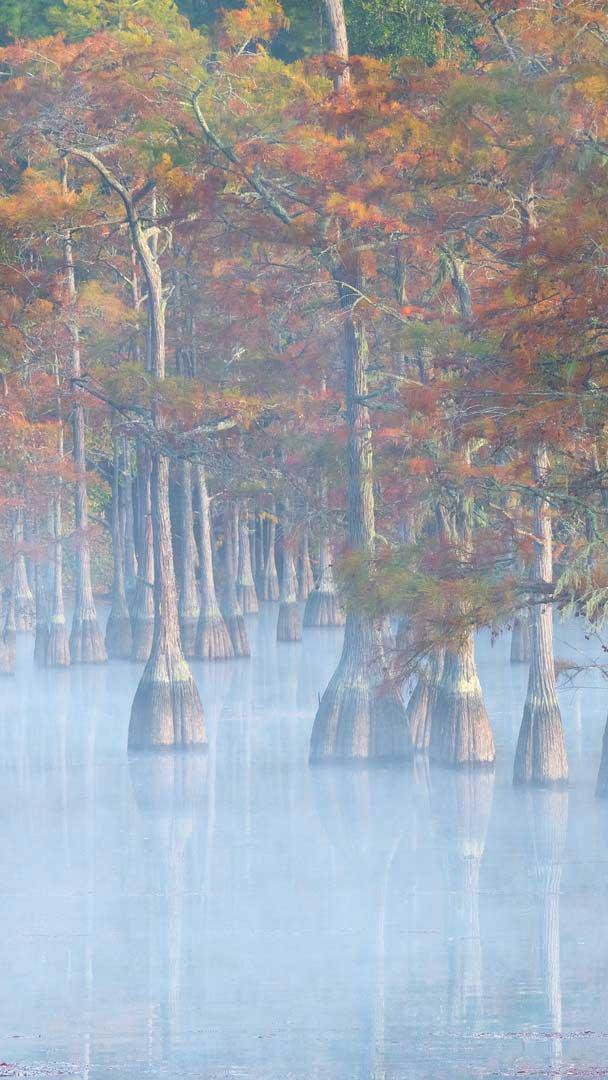 Ever seen the sturdy, swamp-loving and always stylish cypress? These trees can grow to over 30 metres and usually have a pyramid-like shape when they"re young. In today"s image, we"re transported to the George L. Smith State Park, which spans 661 hectares in Emanuel County in Georgia, United States. The park"s centrepiece, seen in today"s image, is the 160-hectare mill pond, a favourite spot for fishing and canoeing. Out of its waters grow pond cypress and bald cypress trees, two varieties that are native to the US. Winding through the park are over 11 kilometres of nature trails, leading visitors through sandy landscapes past a bird sanctuary and tortoise habitat. The hardwood trees here are a haven for woodpeckers and other birds, while the soft soil provides ideal burrowing ground for tortoises. No matter the season, this park promises a peaceful retreat for all.