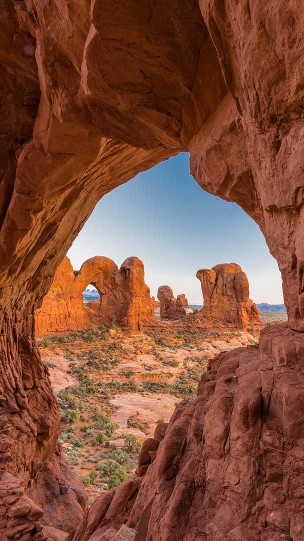 Red as far as the eye can see and clear blue skies overhead. Welcome to Arches National Park, Utah. The story of this otherworldly landscape starts 65 million years ago when a dry seabed stood here. Over time, geological forces warped and squeezed the land, twisting the sandstone into lumps and bumps. Later, wind and water carved out the arches, pinnacles, fins and balanced rocks that now stand in this area. The park has more than 2,000 natural stone arches, the highest concentration of these structures anywhere on Earth.