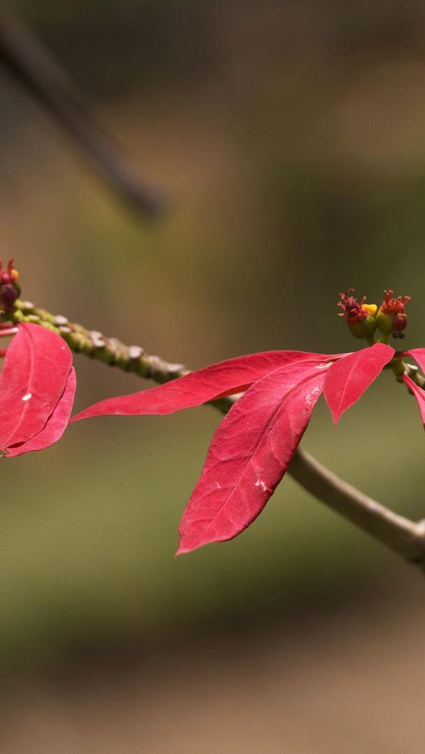 Here"s the red poinsettia, one of the plants known for its striking star-shaped leaves. The poinsettia has become a symbol of Christmas cheer, brightening homes and public spaces across North America. Fun fact: Joel Roberts Poinsett, the first US ambassador to Mexico, introduced these vibrant plants to America in the 1820s after discovering them while exploring the Taxco region in Guerrero. The small yellow structures found at the centre of the vibrant bracts are the actual blooms. These flowers, grouped within cyathia, are crucial to the plant"s reproductive process. Interestingly, the hues of poinsettia bracts result from photoperiodism, a light-sensitive process crucial for their colour transformation.