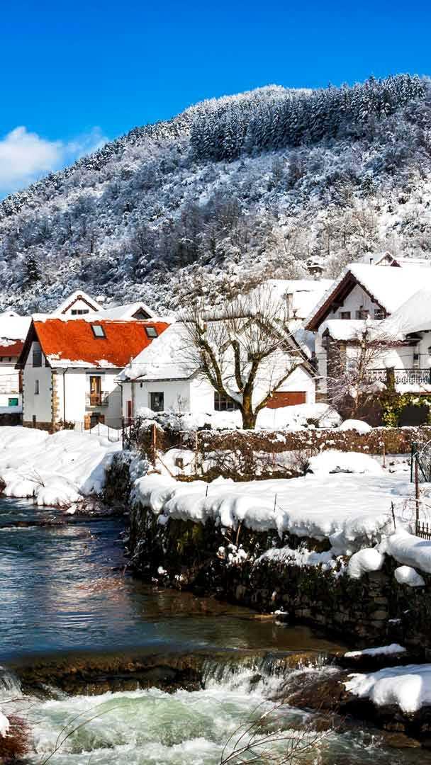 Ochagavía in Spain offers one of Navarre"s most evocative winter scenes. This village of just over 480 residents, located in the Salazar Valley, 85 kilometres from Pamplona, stands out for its traditional architecture, with stone houses, steeply pitched roofs and a medieval bridge over the Anduña River that looks straight out of a postcard.