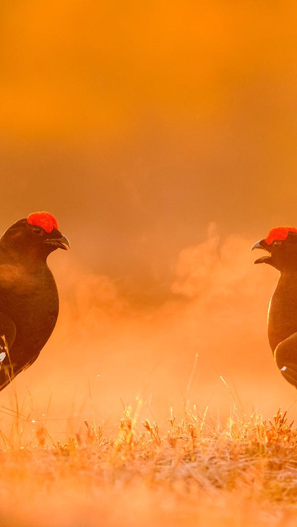 Rivais à vista Tetrazes‑lira machos em competição de lek, Estônia (© Sven Zacek/Nature Picture Library)