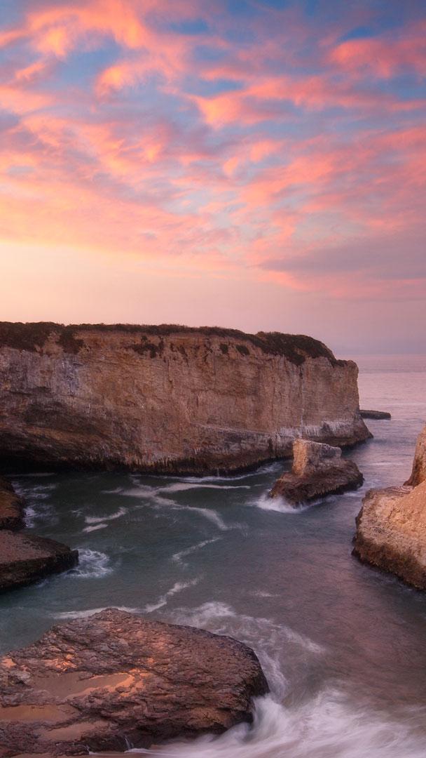 Shark Fin Cove, also known as Shark Tooth Beach, is nestled in a cove in the tiny town of Davenport on California"s Central Coast. The cove is a coastal gem known for its stunning sea stack—a vertical rock formation that resembles a shark"s fin. The fin used to be connected to the mudstone cliff that surrounds the beach. Over time, the relentless crashing waves and strong winds slowly eroded the rock formation. Shark Fin Cove is visible from Highway 1, where travellers can stop and look at the expansive Pacific Ocean views.