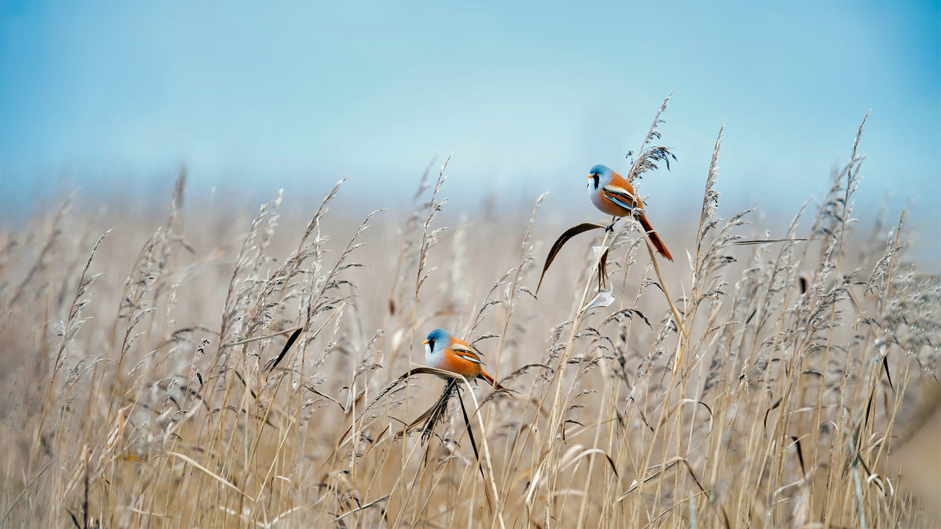 More of a moustache than a beard? Bearded reedlings at a wetland in Flevoland, Netherlands (© Gert-Jan IJzerman/Minden Pictures)