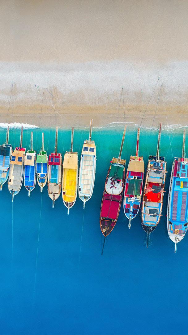 A beach of many colours Aerial view of colorful boats in the Mediterranean Sea in Ölüdeniz, Turkey (© den-belitsky/Getty Images)