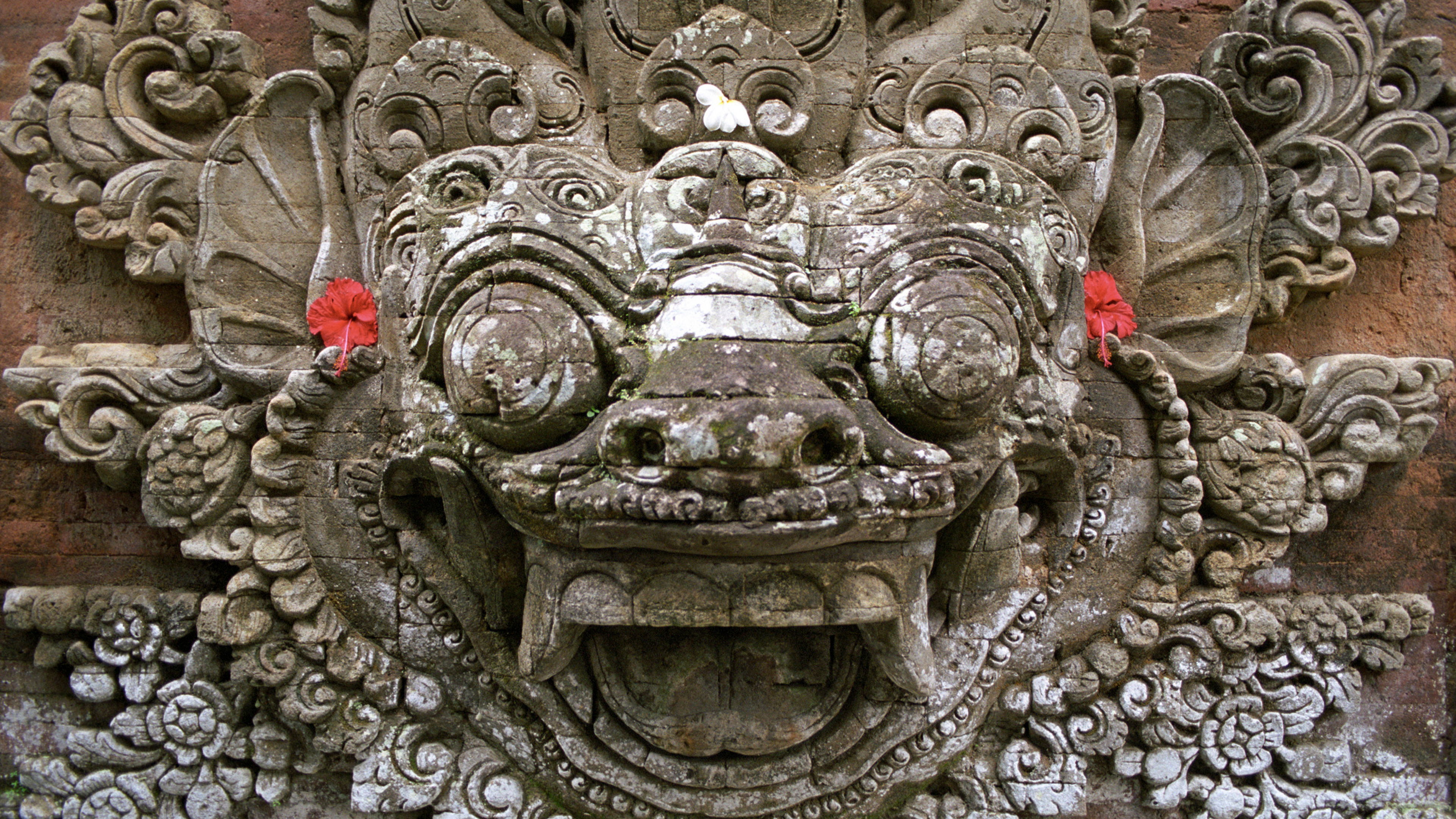 Inmitten ungezähmter Regenwälder, Reisfelder und steiler Schluchten liegt das Dorf Ubud, das kulturelle Herz von Bali, Indonesien. Der Legende nach kam im 8. Jahrhundert ein hinduistischer Priester, Rsi Markandaya, auf die Insel Bali und entdeckte eine Gegend, die reich an Heilkräutern und Pflanzen war. Der Name Ubud leitet sich von dem Wort „ubad“ ab, was so viel wie Medizin bedeutet. Das in die grüne Landschaft eingebettete Dorf ist reich an hinduistischen Tempeln und einer reichen lokalen Mythologie. Die mythische Figur, die auf dem heutigen Bild zu sehen ist, ist ein Barong, ein pantherähnliches Wesen, der König der Geister und ein Symbol des Glücks und des Wohlstands. Der Barong-Tanz, der in einer verzierten Tiermaske aufgeführt wird, ist auf Bali typisch.