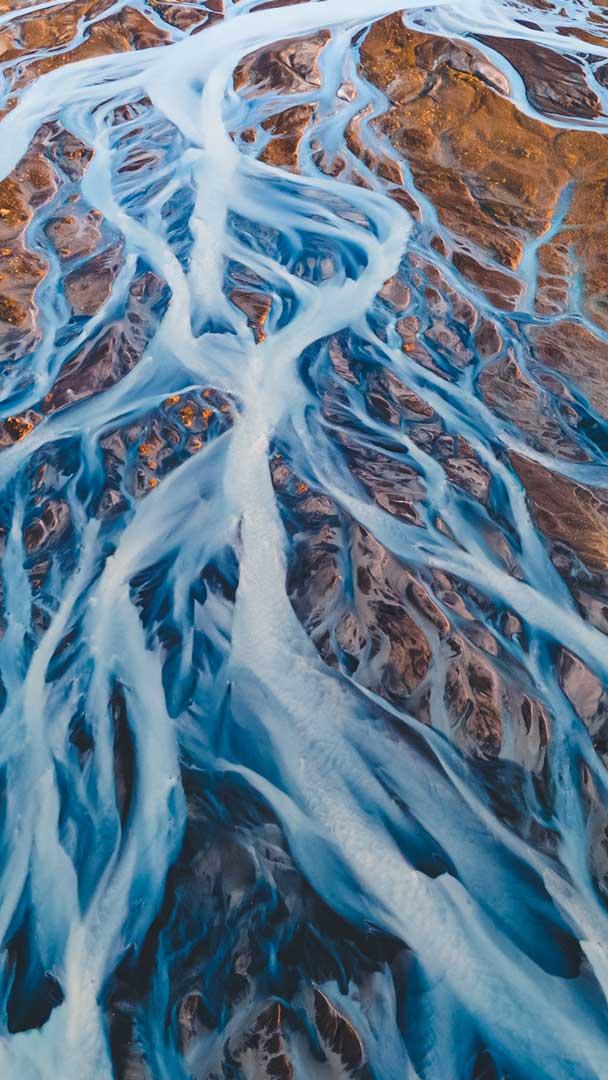 Haben Sie sich schon einmal gefragt, woher diese faszinierenden Flussmuster stammen? Willkommen in Island, dem „Land aus Feuer und Eis“! Die Gletscherflüsse auf dem heutigen Bild entstehen aus dem Schmelzwasser riesiger Gletscher wie Vatnajökull, Langjökull und Hofsjökull. Der Vatnajökull ist der größte Gletscher Islands und bedeckt mehr als 7.700 Quadratkilometer - etwa 10 Prozent der Landesfläche. Wenn die Gletscher schmelzen, transportiert das Wasser feine Sedimente und bildet ein einzigartiges Flusssystem, dessen milchige Farbe im Kontrast zu den erdigen Tönen des vulkanischen Terrains steht. Jeden Frühling und Sommer schwellen die Flüsse durch die saisonale Schneeschmelze an und formen die Landschaft immer wieder neu.