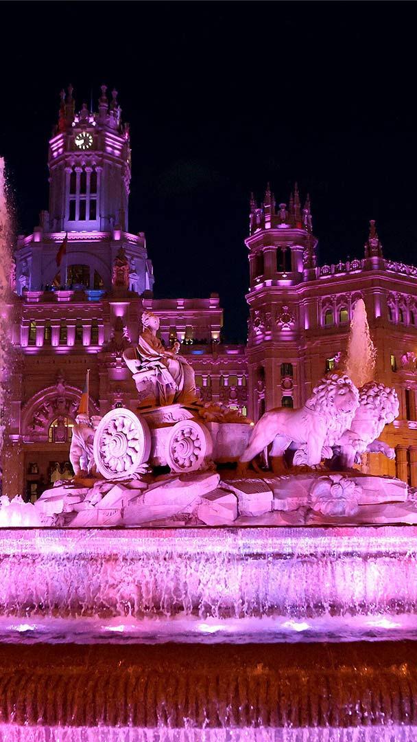 Wir feiern die Frauen Der Cibeles-Brunnen ist anlässlich des Internationalen Frauentags beleuchtet, Madrid, Spanien (© dpa picture alliance/Alamy)