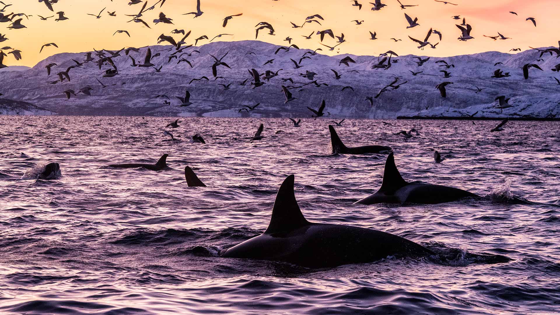 Was treiben diese Raubtiere? Schwertwale in Spildra, Norwegen (© Alex Mustard/Minden Pictures)