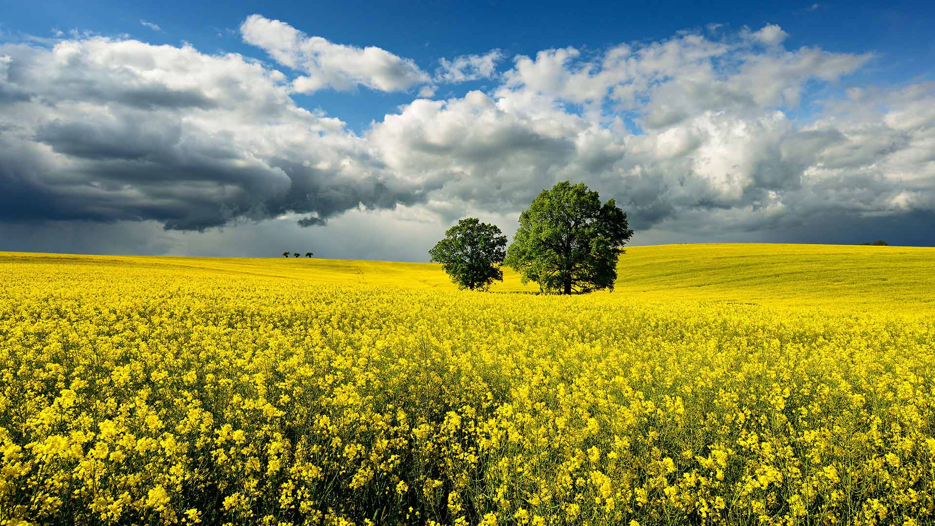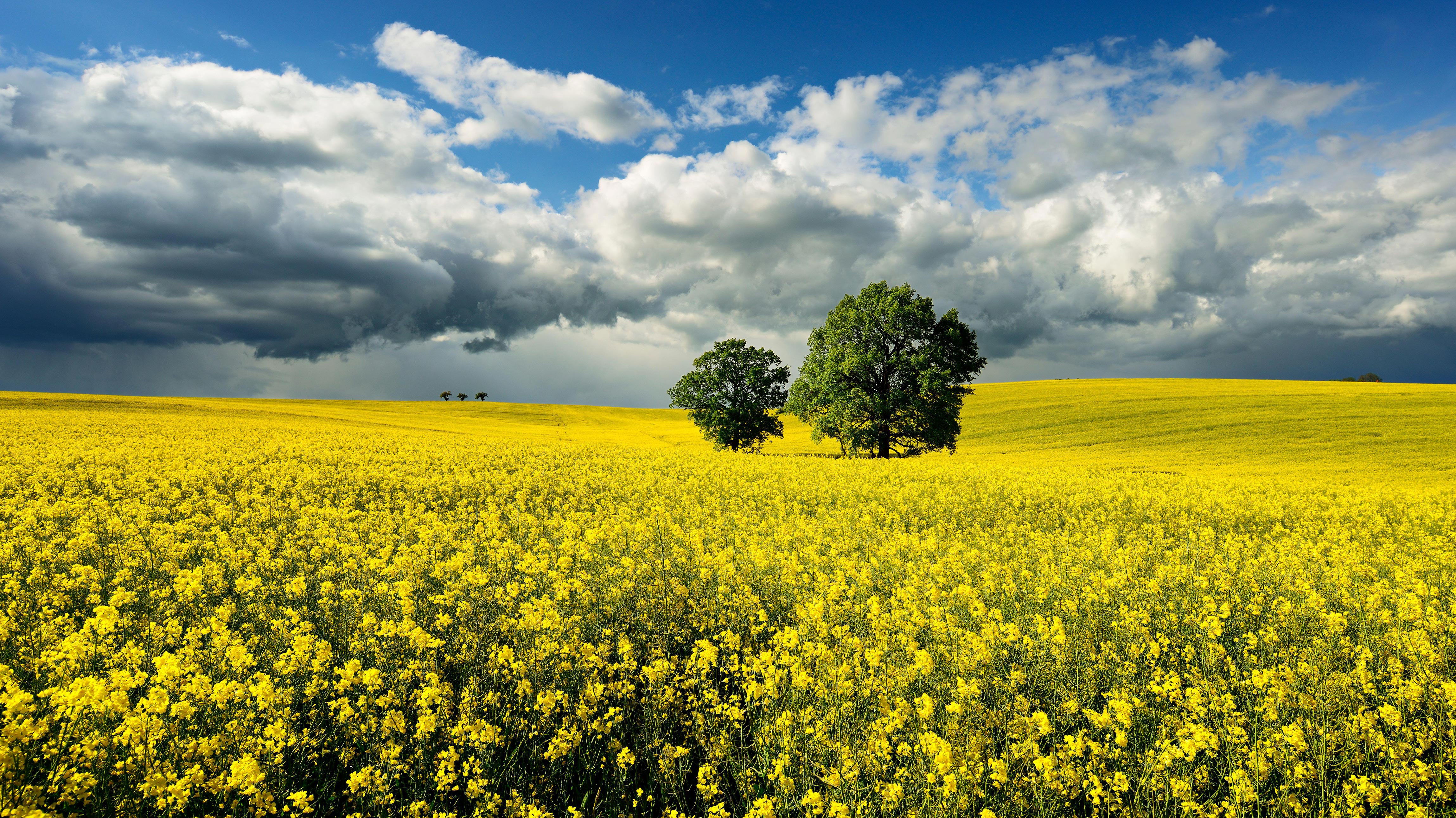 Bald ist Erntezeit Eichen in einem Rapsfeld bei aufziehendem Gewitter, Sachsen-Anhalt (© mauritius images GmbH/Alamy Stock Photo)