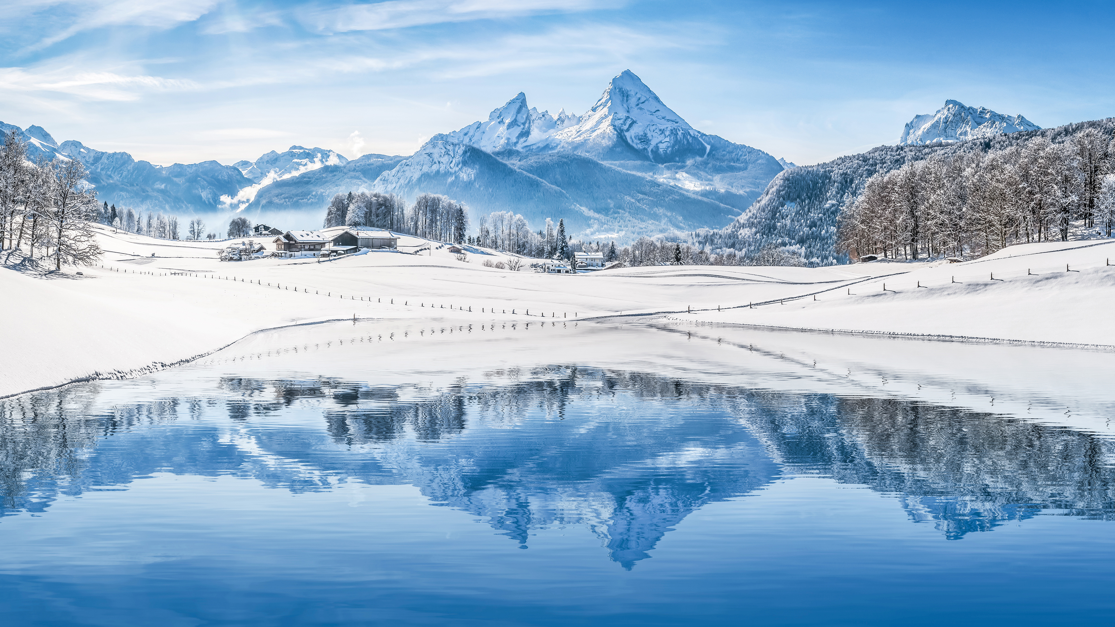 Die klare Winterluft liegt über der verschneiten Berglandschaft der Alpen, die majestätischen Gipfel spiegeln sich im glatten Spiegel des zugefrorenen Sees. Die verschneiten Bäume ringsum zeugen von einer harmonischen Stille und Ruhe, die nur durch das leise Knirschen des Schnees unter den Schritten unterbrochen wird. Die Sonne wirft ihre Strahlen auf die Landschaft und den See, lässt uns innehalten und Wohlbefinden spüren.