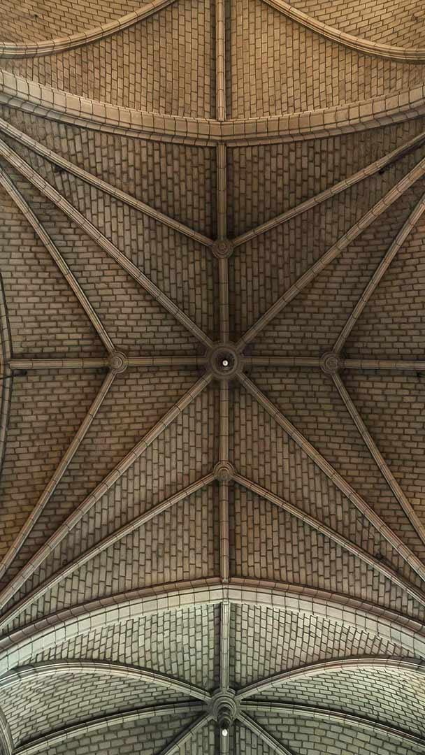 Las bóvedas de la iglesia de Notre-Dame de Bon-Port en Les Sables-d"Olonne, Francia, muestran un diseño gótico asociado a la tradición francesa con arcos apuntados que realzan la verticalidad del templo y una estructura iniciada en 1646 según documentación histórica. La piedra clara y la organización del espacio generan una sensación de amplitud que refleja el espíritu religioso de una comunidad marinera que en el siglo XVII buscaba protección espiritual antes de embarcarse en largas travesías.