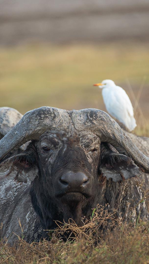 El búfalo africano es uno de los grandes protagonistas del cráter del Ngorongoro (Tanzania), un antiguo volcán colapsado que conserva un ecosistema único. En este paisaje las manadas se mueven con calma aparente, aunque cada individuo mantiene un carácter fuerte. Los búfalos destacan por su resistencia y por la impresionante forma de sus cuernos, que pueden llegar a fusionarse en un escudo óseo en la frente. Esta adaptación les ayuda en enfrentamientos y en la defensa frente a depredadores como los leones.