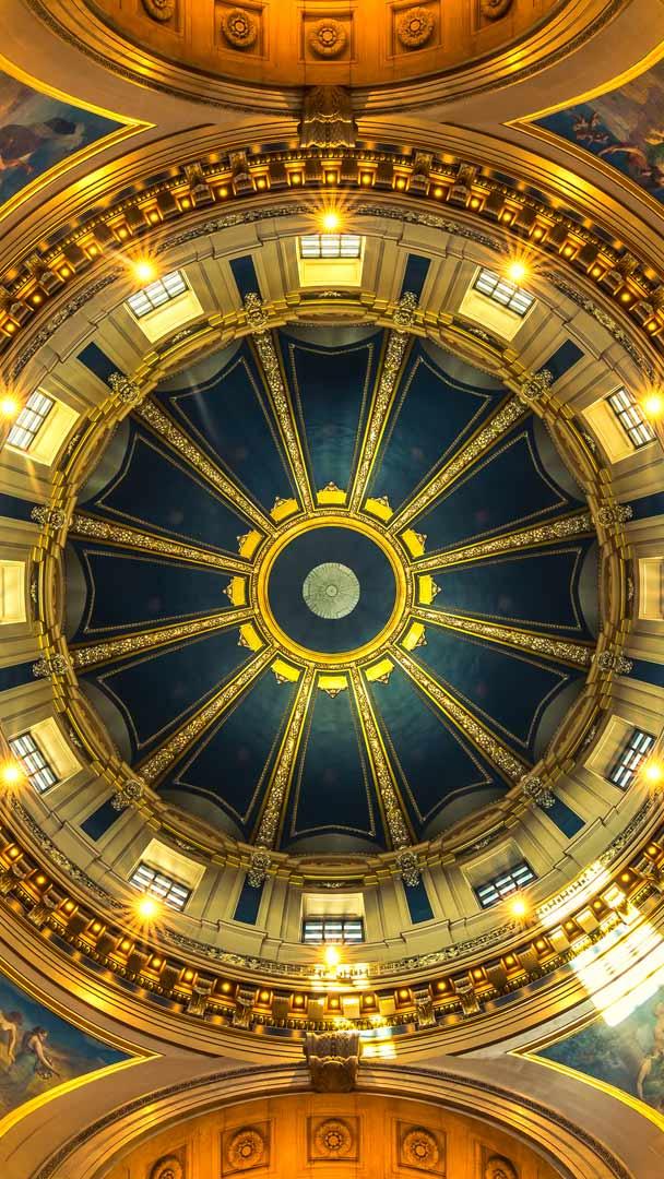 Vue de l’intérieur, la coupole du Capitole de l’État du Minnesota, à Saint Paul aux États-Unis, offre un spectacle de symétrie et de lumière. Inauguré en 1905, ce bâtiment officiel s’inspire des grandes basiliques européennes, et notamment de Saint-Pierre de Rome. Il abrite le Sénat, la Chambre des représentants et le bureau du gouverneur.