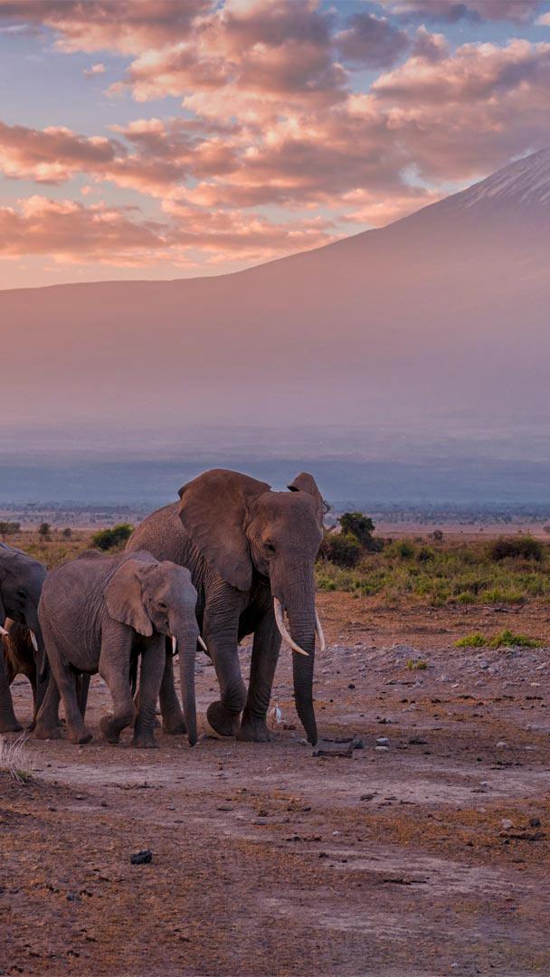 Majestueuses et vulnérables créatures Éléphants près du Kilimandjaro, parc national d’Amboseli, Kenya (© Diana Robinson Photography/Getty Images)