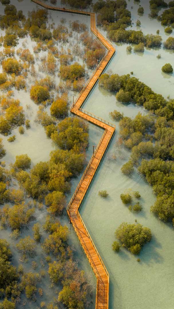 Faites coucou aux halophytes ! Parc de mangrove de l’île Jubail à Abou Dabi, Émirats Arabes Unis (© Amazing Aerial Premium/Shutterstock)