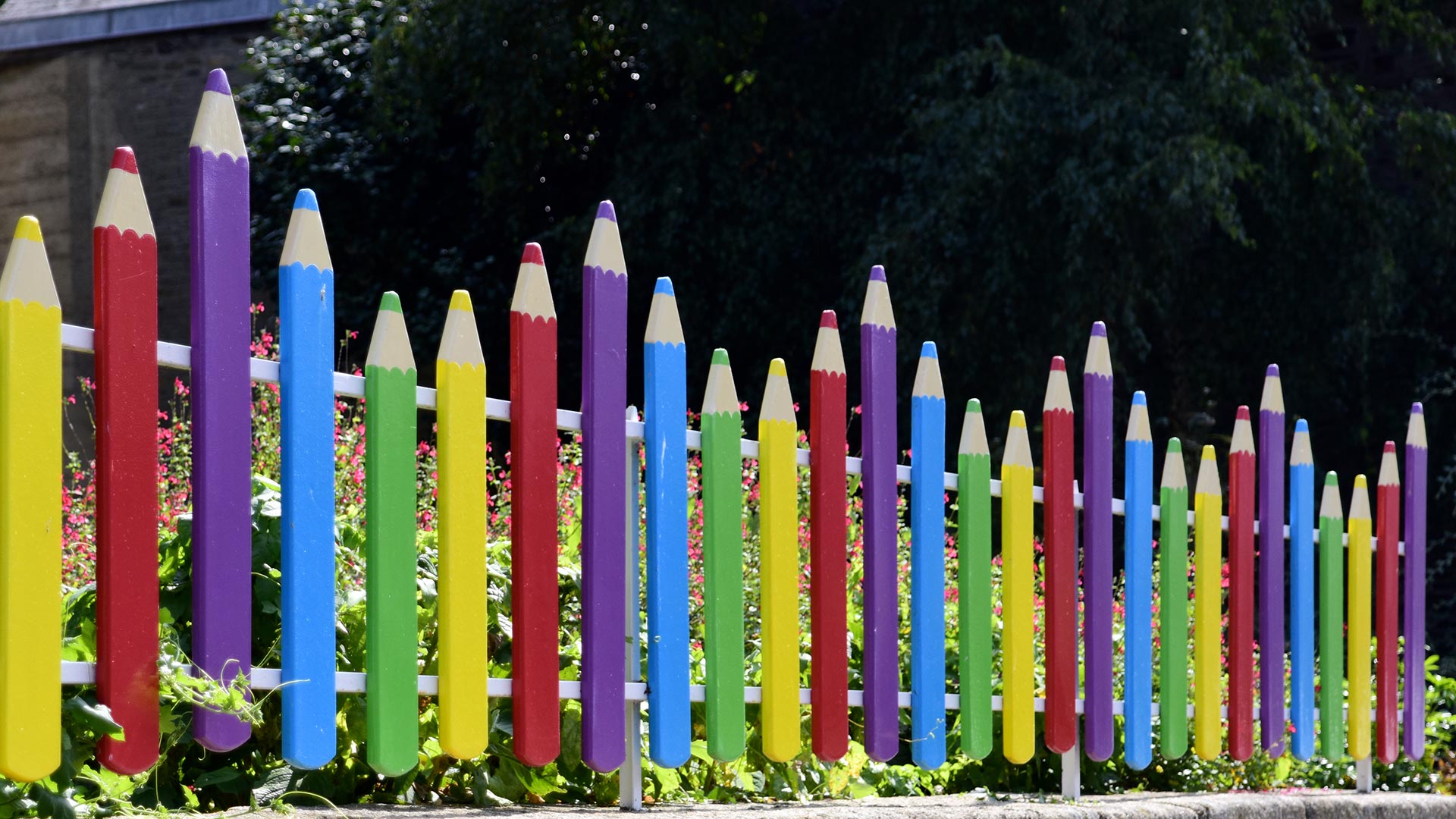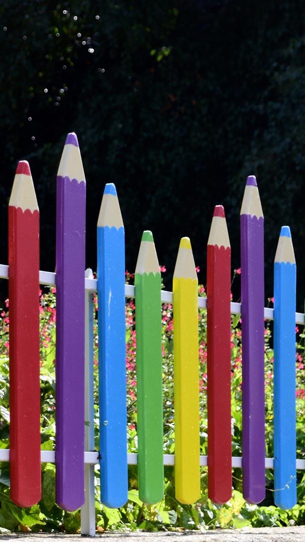 Cest reparti pour un tour ! Clôture en bois en forme de crayons de couleur devant une école de Bretagne (© PeterAprahamian/Getty Images)