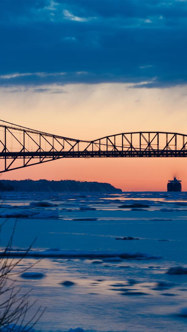 Spanning the soft sunlight Quebec Bridge across the lower Saint Lawrence River, Canada (© Ronald Santerre/Getty Images)
