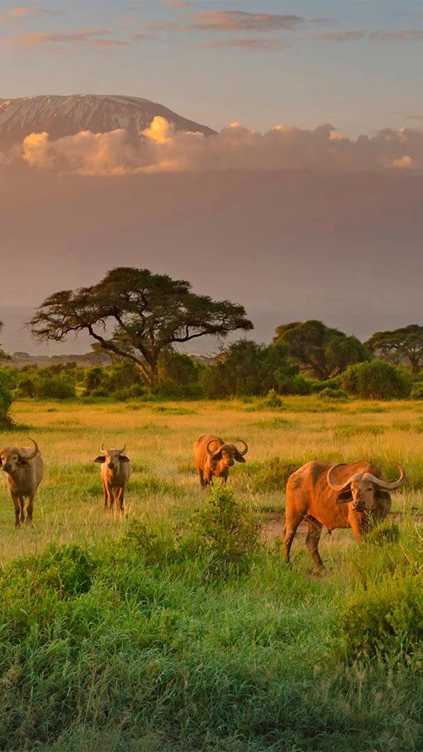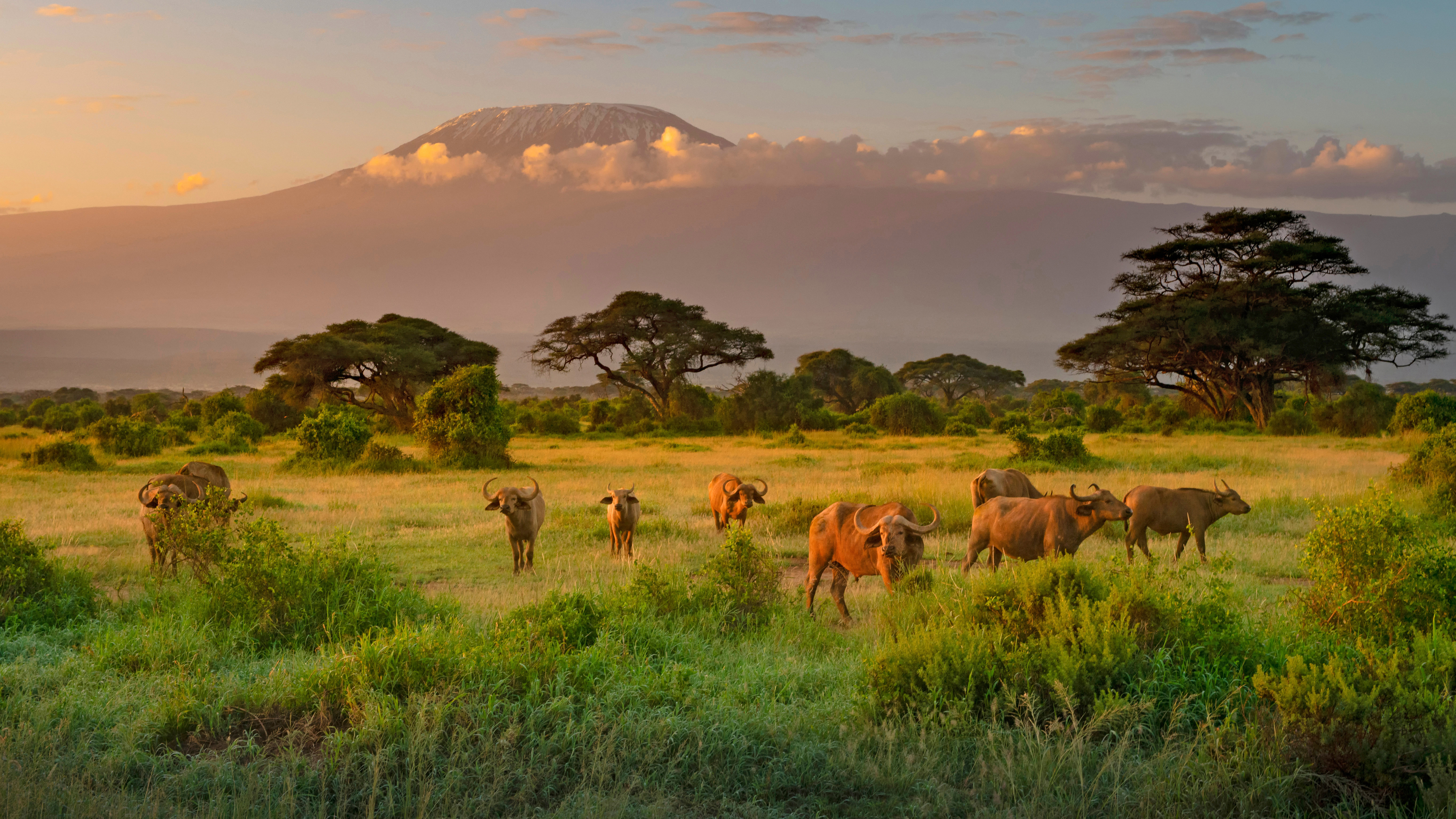 An experiment in sustainability Mount Kilimanjaro with Cape buffalo in foreground, Amboseli Biosphere Reserve, Kenya (© RealityImages/Shutterstock)