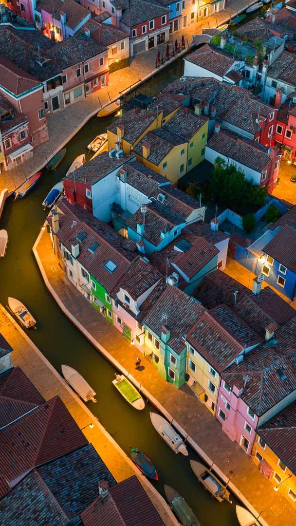 È qui il festival? Vista aerea delle case colorate dellisola di Burano, Laguna di Venezia, Veneto (© Pol Albarrán/Moment)