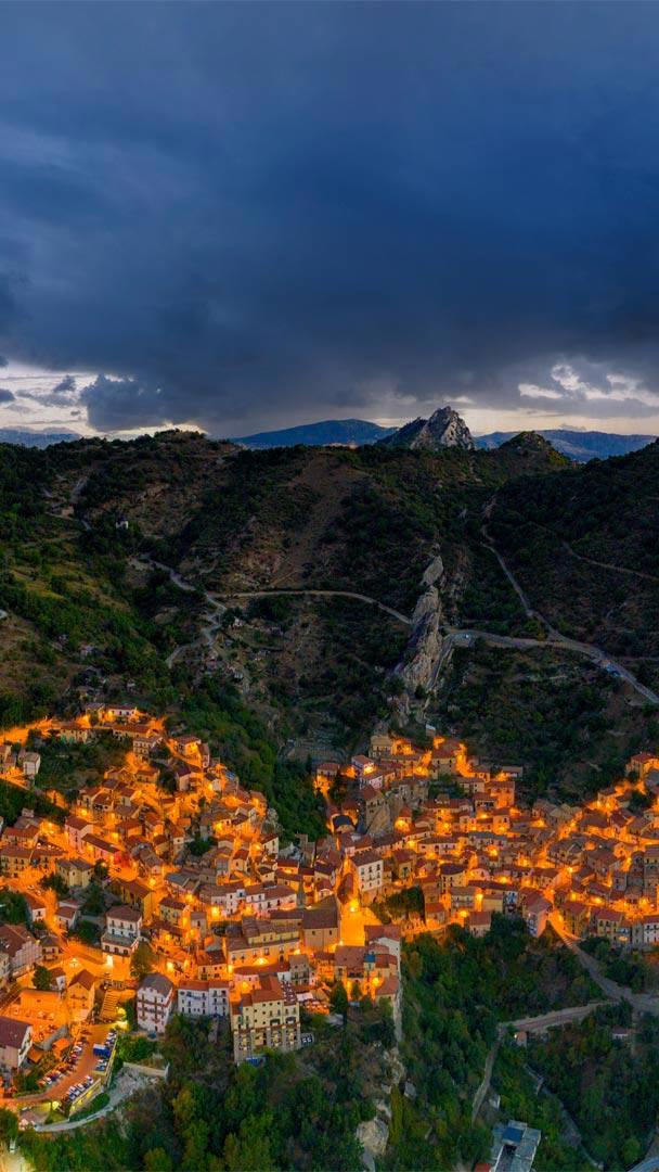Una città scintillante in cima a una collina Villaggio di Castelmezzano, Potenza, Basilicata, Italia (© Roberto Moiola/Getty Images)