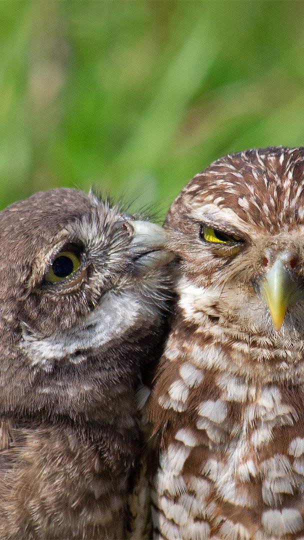 Due gufi un po’ civettuoli Un pulcino di civetta delle tane e un adulto nel sud della Florida, Stati Uniti (© Carlos Carreno/Getty Images)