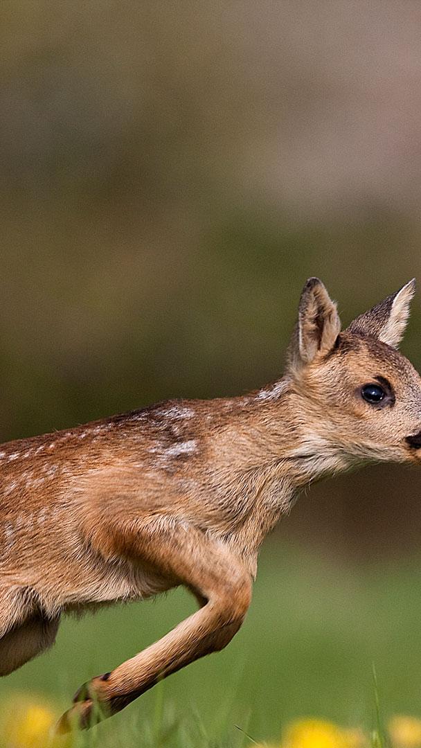 Eccoci qua! Piccolo di capriolo che corre sullerba in Normandia, Francia (© Gerard Lacz/Minden)