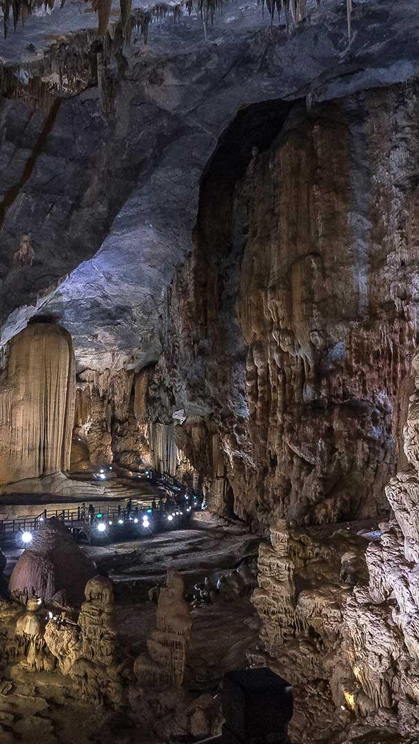 ここはベトナム中部のフォンニャ・ケバン国立公園の奥深くに広がる洞窟、「天国の洞」です。全長は 30km を超え、アジア最長級の乾燥洞窟のひとつとして知られています。長い年月をかけて形成された高い天井や広大な洞室、複雑で美しい石灰岩の造形が続き、照明に照らされた石柱や鍾乳石が幻想的な景観を演出しています。公開されているのは全体のごく一部に過ぎませんが、洞窟の大半は手つかずのまま保護されています。