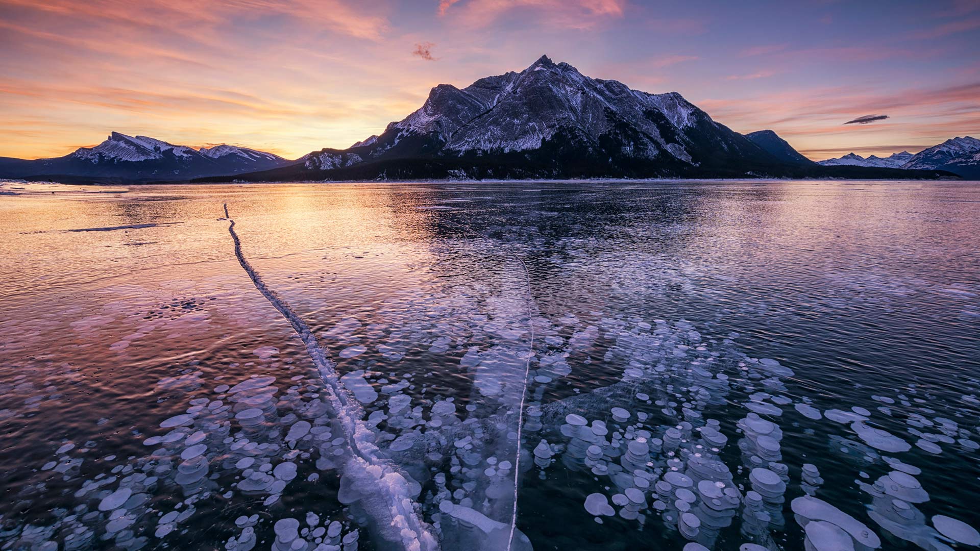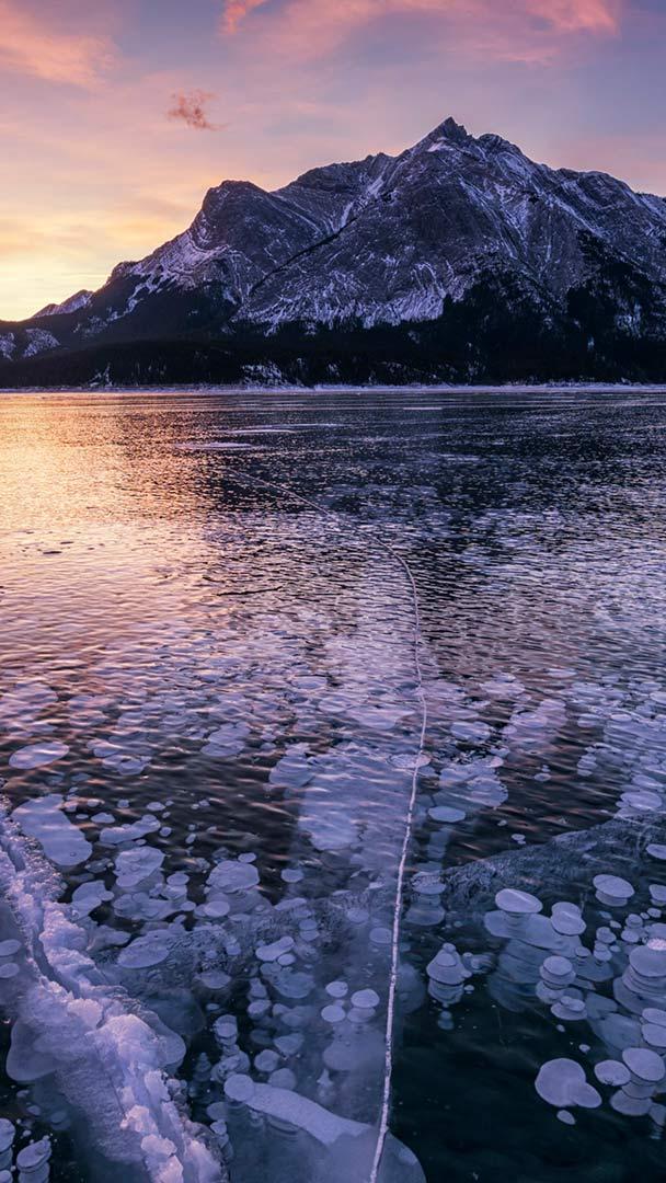 氷の泡に覆われた湖 ミッチェナー山と凍ったアブラハムレイク, カナダ アルバータ州 (© Tom Mackie/plainpicture)