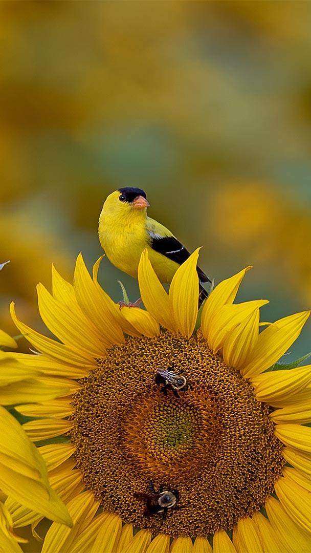 米国の野鳥とヒマワリ オウゴンヒワとヒマワリ, 米国 サウスカロライナ州 (© Teresa Kopec/Getty Images)