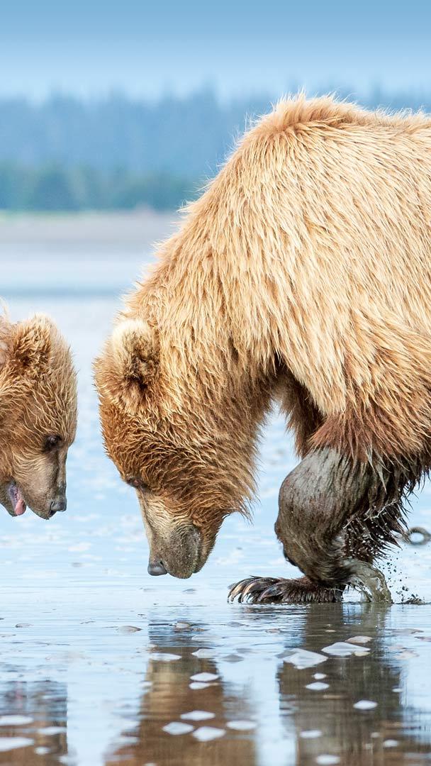 水辺で捕食中のヒグマの親子 レイク・クラーク国立公園, 米国 アラスカ州 (© Carlos Carreno/Getty Images)