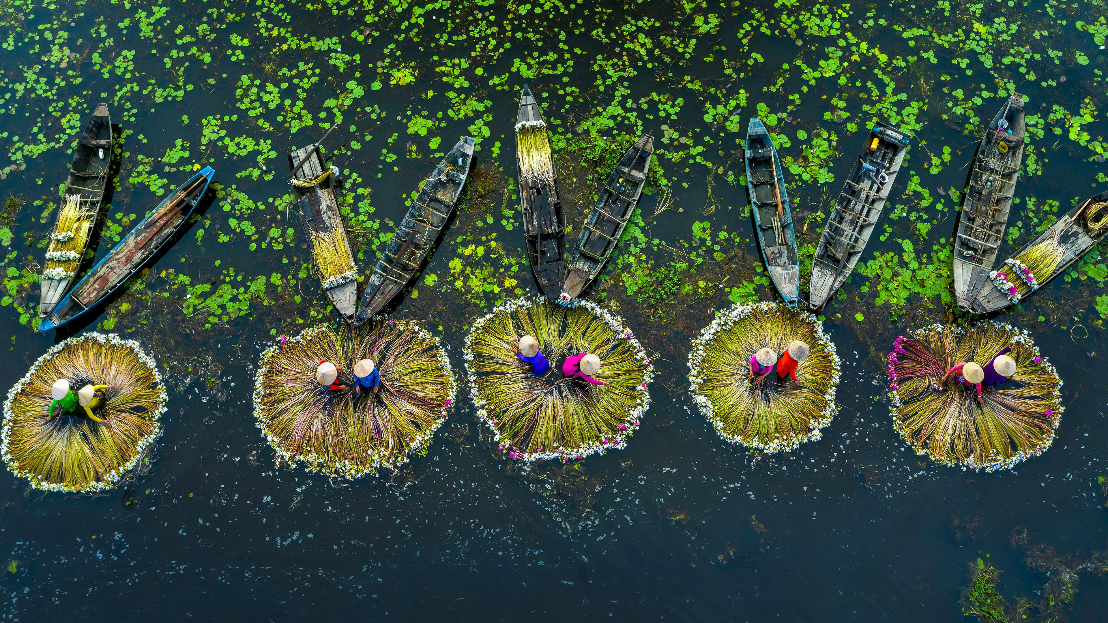 睡蓮を収穫している人たち © Khanh Phan/Solent News/Shutterstock