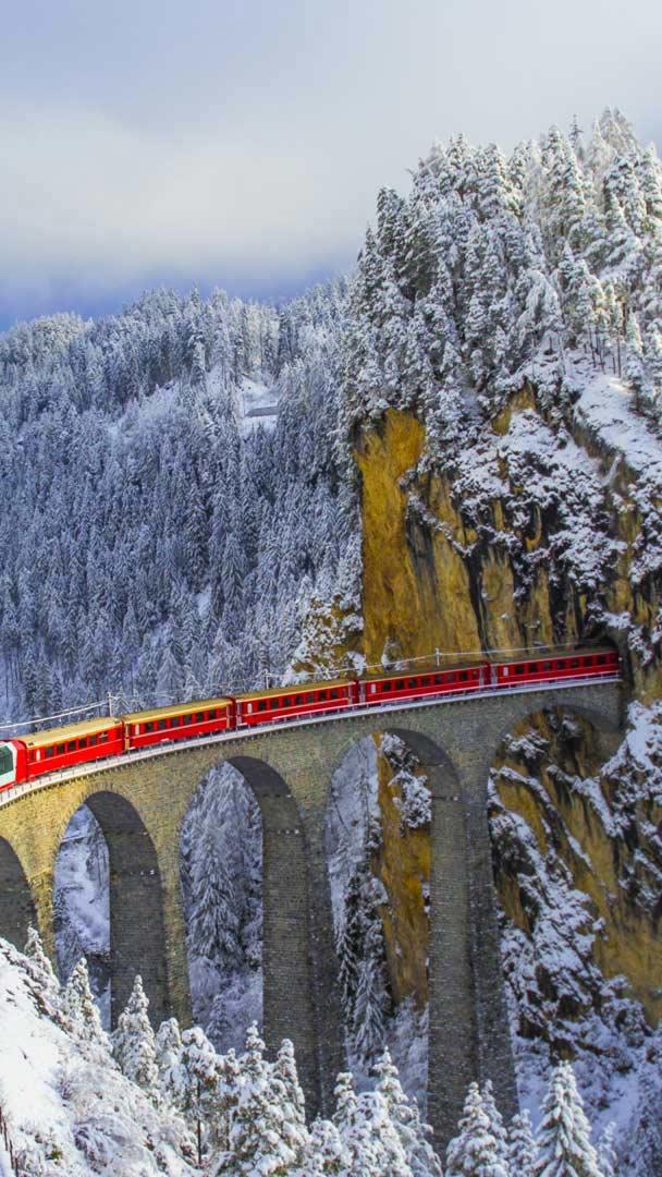 Often called the most beautiful train ride in Switzerland, if not the world, the Bernina Express offers spectacular views on its sightseeing routes that connect towns in southeastern Switzerland to Tirano, Italy. It"s been in operation here since the late 1800s. The classic route takes about four hours and departs from Chur, Switzerland. Outfitted with panoramic windows, the train passes through 55 tunnels and over 196 bridges, some more than 100 years old, like the Landwasser Viaduct pictured on our homepage today. The cheerful red train winds its way up and over the Bernina Pass in the Alps, reaching an elevation of 7,392 feet. Pay special attention during the stretch from Thusis to Tirano—this portion of the route was designated a World Heritage site in 2008. Reservations recommended!