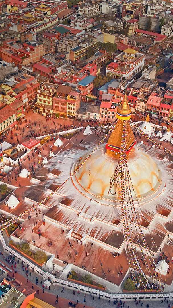 Today we"re in Kathmandu, Nepal, where the Boudhanath stupa stands out against the skyline. A UNESCO World Heritage site, the stupa is on the ancient trade route from Tibet—traders have rested and offered prayers here for centuries. Like all stupas, Boudhanath is a mound-like structure containing relics. It was first built sometime after the 600s, when Buddhism was first spreading through Tibet and Nepal. It"s long been a major pilgrimage site for Buddhists, and is said to entomb the remains of Kassapa Buddha, one of the 29 named ancient Buddhas.