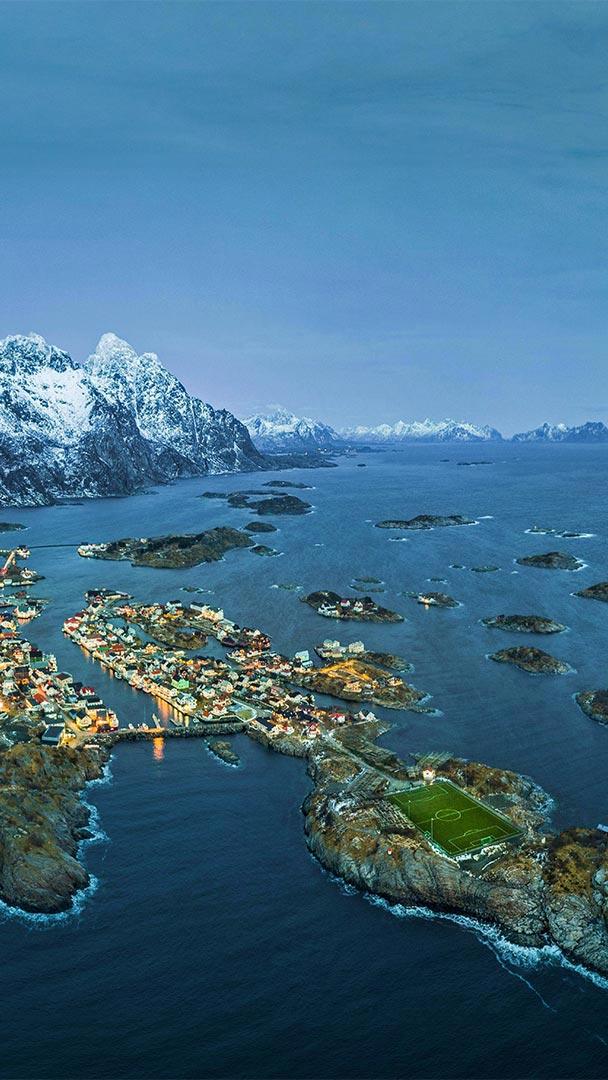 Home to only about 500 folks, the far-flung village of Henningsvær, Norway, is recognized for its historic charm and as part of the Lofoten Archipelago"s important cod fishery. And thanks to the recent boom in drone photography, the Arctic hamlet with the unlikely soccer field has come to be regarded among the most scenic on Earth. The Henningsvær Idrettslag Stadion (in our photo"s lower center) lies at Henningsvær"s southern tip, on flat ground hewn out of the rocky outcrop. Look closely at the hills around the stadium and you"ll see wooden racks for drying cod—a reminder that even though there"s space for fun on these tiny islets, the business of fishing is still very much a key part of life here.