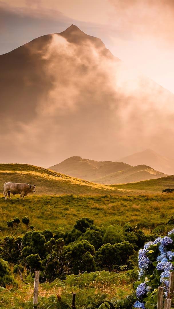 A bull, some flowers, and a stratovolcano © Atmo-Sphere/Getty Images