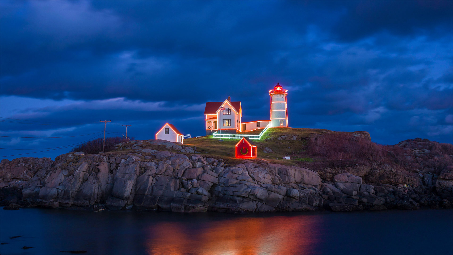 This classic New England scene is Cape Neddick Light, one of the most iconic of Maine"s 65 lighthouses, all lit up for the holiday season. Built on more than 2 acres of granite island, the Nub has been protecting sailors since 1879. It"s a tradition for locals to visit when it"s dressed up for the holidays. And if you miss the winter display, you can come back in July, when the lighthouse is relit for summer visitors.