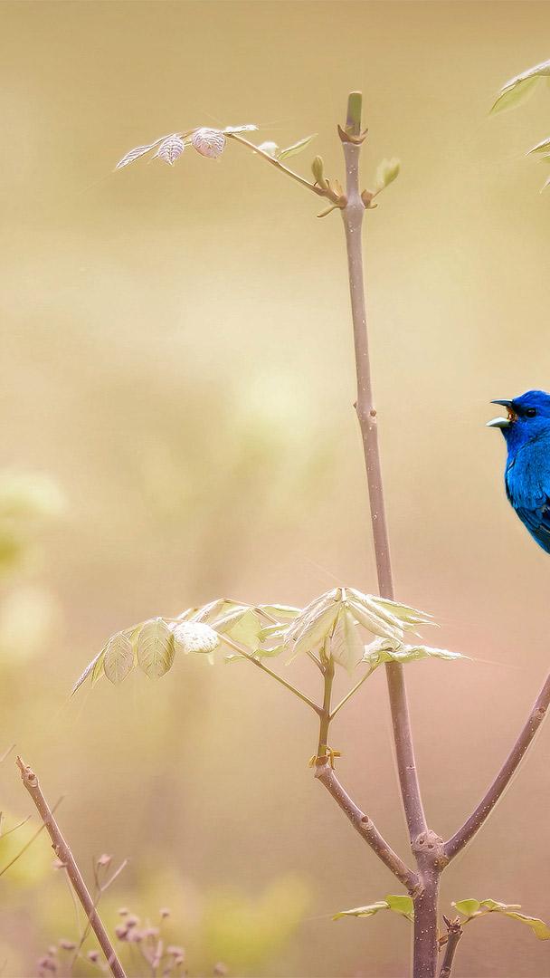 This time of year, from late spring to summer, male adult indigo buntings take it up a notch and turn a brilliant deep blue. They fly up to a perch—like our cheerful fellow atop a branch—and sing from morning to night to defend their territory from other males and to catch the attention of females. Indigo buntings are members of the "blue" clade (subgroup) of the cardinal family.