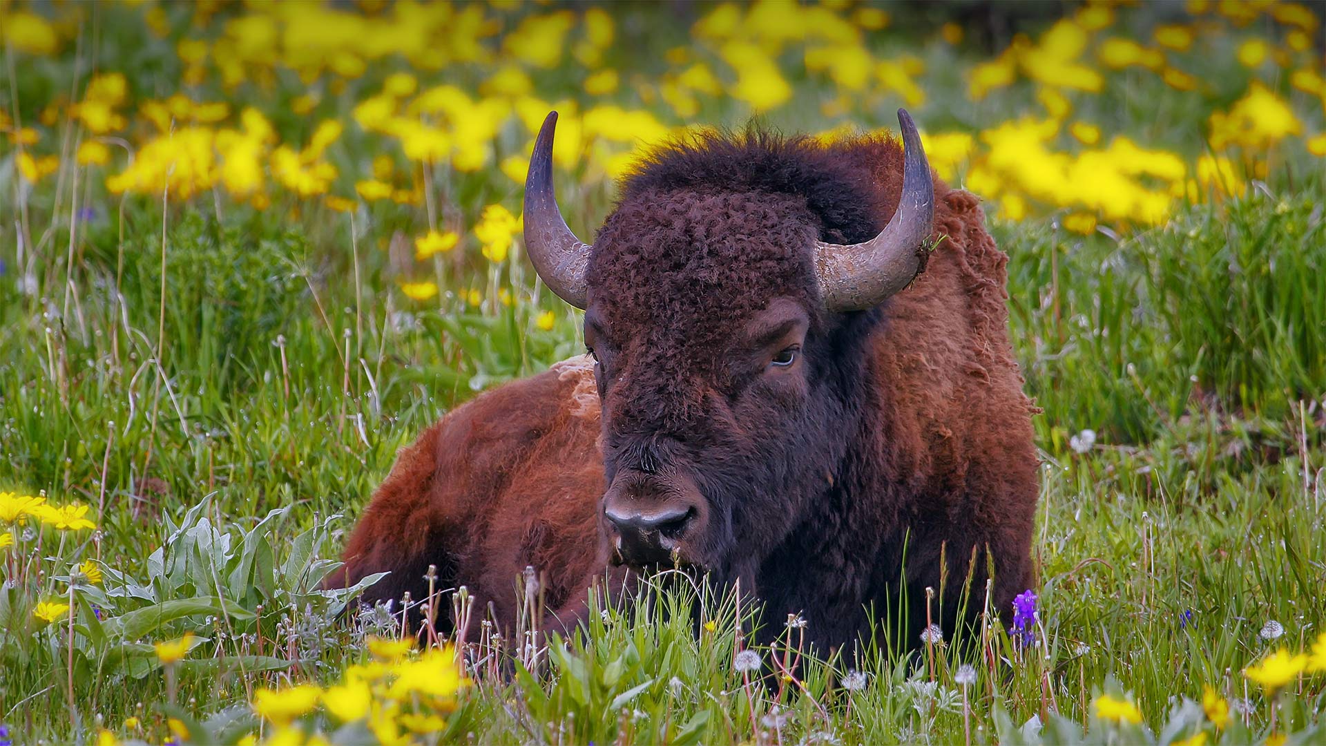 July is National Bison Month and we"ve chosen today to honor America"s official and largest land-dwelling mammal. The male American bison in today"s photo is lazing among wildflowers in Yellowstone National Park, the only place in the country where there"s been a continuous population of bison since prehistoric times. Once widespread across the American plains and revered by Native Americans, they numbered in the tens of millions. Tragically, settlers hunted the bison nearly to extinction by the late 1800s. Fewer than 1,000 of the giants were left in 1905 when the American Bison Society was formed to save them. These days, the population has stabilized with a little more than half a million bison spread across the country, with a few thousand living freely on the plains at Yellowstone.