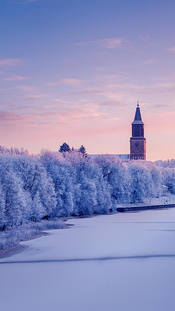 The Turku Cathedral rises above the frosted forests near the mouth of the Aura River, which runs through the middle of Turku, Finland.